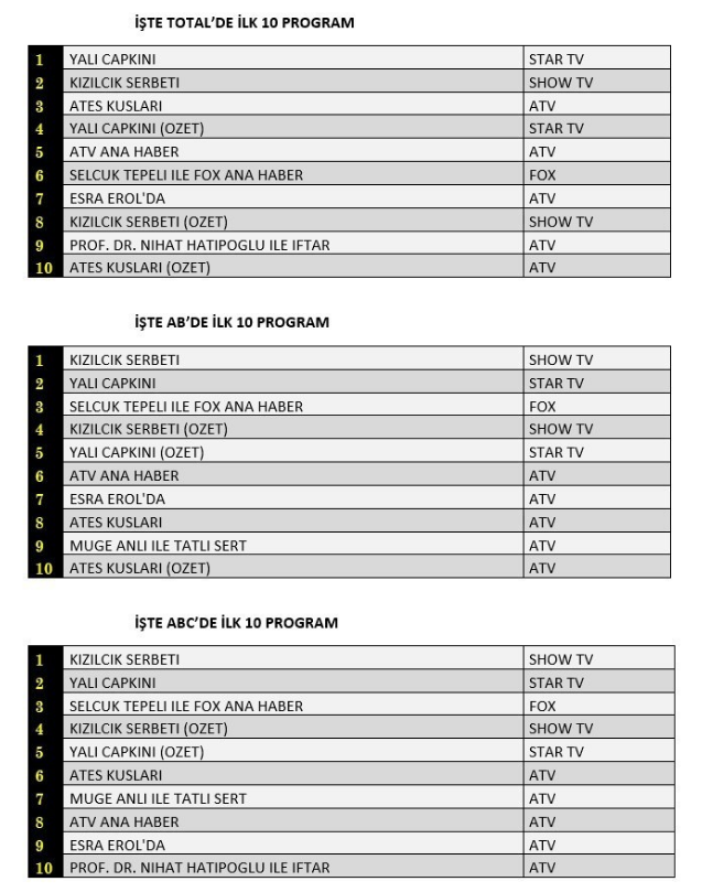 AB kategorisinde ise reyting sıralaması şu şekilde oluştu: