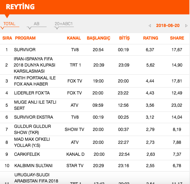 19 Haziran Salı günü reyting savaşlarında peki galip çıkan taraf kim oldu? Survivor mı? İran İspanya Dünya Kupası mı? Fatih Portakal mı?